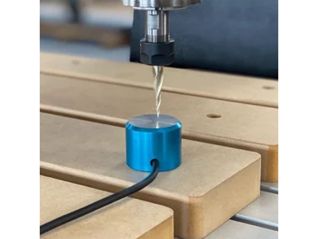 Jakmile do vřetena vložíte nový nástroj, je třeba přesně změřit délku vašeho nástroje vzhledem k dílci nebo pracovnímu stolu. Dotykový senzor snadno zapojíte do konektoru na portálu frézky, senzor pak položíte pod nástroj a prostřednictvím programu UCCNC a jeho funkce AUTO Touch-Off se délka nástroje automaticky změří a uloží do programu UCCNC.