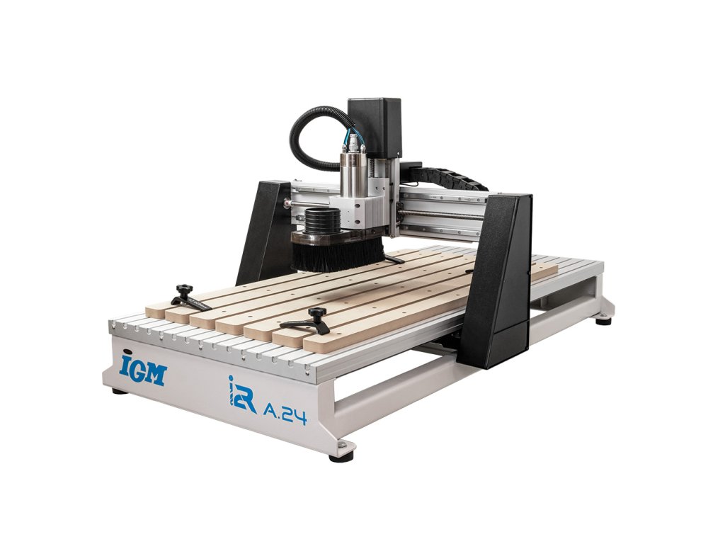 Malá 3-osá 2D i 3D CNC frézka IGM i2R A24 na dřevo, plast i kov s vřetenem o výkonu 2200 W a pracovním rozsahem 610 x 1220. Jednoduché ovládání díky UCCNC softwaru a senzory přiblížení pro přesnou kalibraci os.
