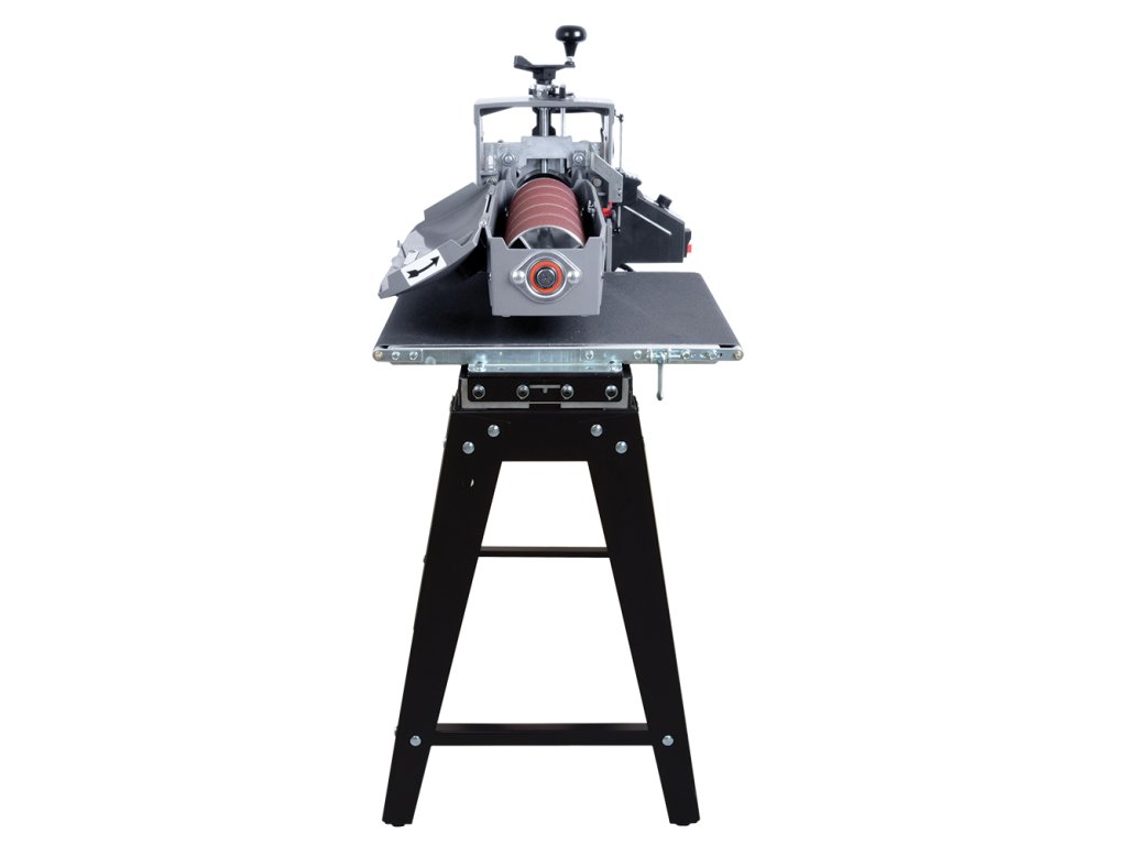 Přesnost podél šířky celého dílce je zaručena nejen tuhou litinovou konstrukcí, ale také přesným paralelním srovnáním mezi válcem a posuvným pásem. Bruska je vybavená pákou pro rychlé přenastavení, kterou využijete při broušení širokých dílců. Páka lehce přizvedne posuvný stůl, čímž zamezí vzniku rýh na části dílce přesahující přes válec. Samostatný motor pásu posuvu je umístěn na zadní straně brusky a pás je tak spíše tažen, než tlačen.