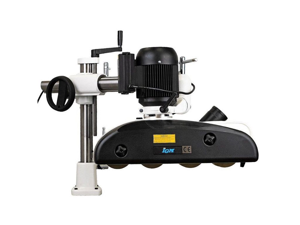 Profesionální kategorie podavače materiálu se čtyřmi odpruženými rolnami, které mají výbornou přilnavost a skvěle se vyrovnávají s nerovnostmi. Je ideální pro konstantní posuv při frézování nebo řezání dřeva i jiných materiálů. Volit můžete z osmi rychlostí podávání, které se mění pozicí ozubených kol po sejmutí krytu. Zpětný chod se ovládá ručním ovladačem. Vodorovná i svislá poloha podavače se nastavuje na universálním stojanu pomocí dvou ovládacích šroubů a poté se bezpečně zajistí. Hlavu podavače lze otáčet všemi směry (360°), takže jej lze použít k vodorovnému nebo svislému tlaku na materiál. Může být namontován přímo ke stroji šrouby (nutno vrtat díry do stolu) nebo pomocí IGM Instalační desky pro podavače. Pro použití na profesionální frézce nebo srovnávačce či kotoučové pile při dlouhodobém provozu. Je možno vybavit IGM Odklápěcím zařízením (kód: 141-FP) pro snadné a rychlé odklopení bez nutnosti odmontování.