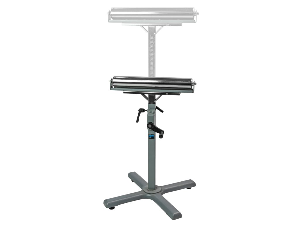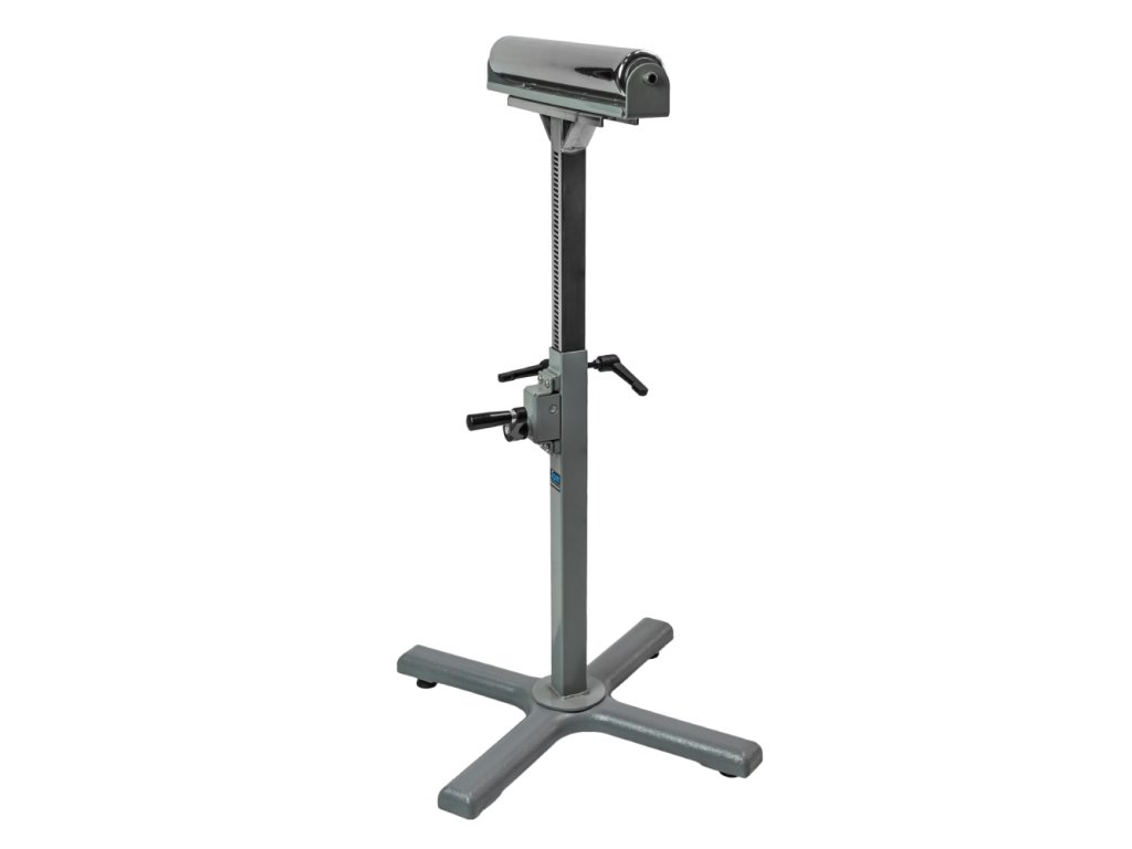 IGM Válečkový podpěrný stojan s rolnou se odlišuje od ostatních a to tím, že výšku rolny nastavujete pohodlně pomocí kliky. Tento zvedací systém funguje pomocí ozubeného kola a pastorku, který umožňuje snadné a přesné nastavení výšky. Stojan je ideální při srovnávání a tloušťkováni desek, a to díky rychlé a snadné změně výšky stojanu po přenastavení stroje. Podpěrný stojan je možné využít při broušení válcovou bruskou a u podobných strojů, kde je třeba podepřít materiál po vyjetí ze stroje. Dvě pojistné páky výsuvného ramene zabraňují sesunutí rolny z nastavené výšky. Rolna má průměr 55 mm, délku 400 mm a je osazena kuličkovými ložisky pro plynulé otáčení. Čtyřramenný litinový podstavec má plastové a výškově nastavitelné nožky, které umožňují přizpůsobení na nerovné podlaze. Výšku rolny můžete libovolně nastavit v rozmezí 660 mm až 1060 mm.