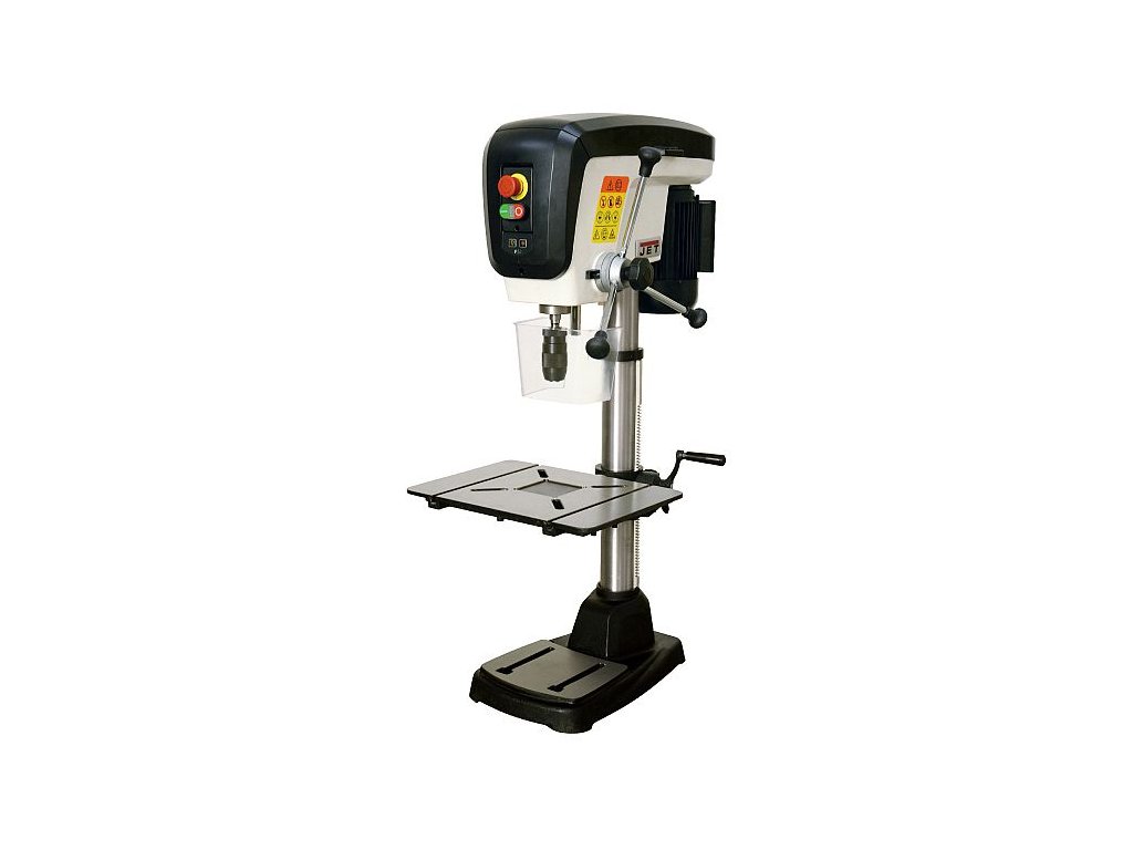 Jet JDP-15B je stolní sloupová vrtačka konstruovaná speciálně pro práci se dřevem. Klíčové vlastnosti této vrtačky jsou, 80mm dlouhý chod s jedním otočením rukojeti a integrovanou hloubkovou zarážkou pro opakovanou přesnost vrtání. Efektivní hnací klínové řemeny poskytují plynulý chod bez vibrací s maximálním přenosem výkonu motoru na hřídel. K dispozici je rychlý systém pro napínání pásu bez použití nářadí, který umožňuje jednoduchou a snadnou změnu rychlosti otáček. Horní ochranný kryt pásů je držen magneticky a má bezpečnostní ochranný spínač. Stůl nabízí extra velkou pracovní plochu. Je vyroben s obrobené litiny a pro snadné upínání je vybaven dvěma T drážkami a středovou výškově nastavitelnou vložkou. Přesný stůl lze snadno naklonit na 45 ° na obě strany a také nastavit tak, aby byla zajištěna kolmost středové osy sklíčidla. Výška stolu lze nastavit hladkým systémem přes ozubený pastorek, přičemž ovládací páka je oddělená od stolu. Výkonný indukční motor je pevně připevněn ke konstrukci, aby se zabránilo ohybu a vibracím. Jasné LED pracovní světlo je zapuštěno do odlitku vřeteníku a k dispozici je také laserový naváděcí kříž pro snadné vyhledání vrtaného středu. Komplexní systém hloubkového dorazu umožňuje přesné vrtání slepých otvorů, které je vždy přesné. Tento stroj byl navržen tak, aby splňoval nároky zpracovatele dřeva, s dostatečně velkou pracovní plochou, maximální hloubkou vrtání a masivností konstrukce. Hladký běh vřetene, mnoho unikátních funkcí a detailů posouvá tuto sloupovou vrtačku na špičku před konkurenci.