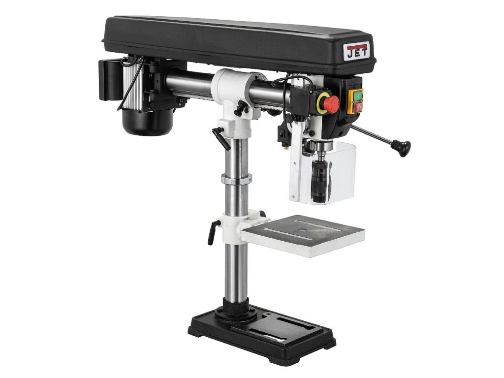 Radiální stolní vrtačka JET JDR-34 má výkonný indukční motor o příkonu 600 W určený pro dlouhodobý chod stroje. Vrtací vřeteno se zdvihem 80 mm je poháněné řemenem s možností volby 5-ti stupňů otáček od 500 do 2500 ot./min. Je vybaveno rychloupínacím sklíčidlem s ochrannou vrstvou s kapacitou 1–16 mm. Má průhledný otočný bezpečnostní kryt proti odlétajícím třískám s bezpečnostním odpojením proudu při výměně nástrojů. Sloup vrtačky je z masivní oceli průměru 62 mm. Litinový stůl má rozměr 220 x 220 mm a lze jej naklopit na obě strany až do svislé polohy tzn. +/- 90 °. Maximální kapacita vrtání je 410 mm (652 mm je od stolu k čelu sklíčidla). Vrtací hlava je sklopitelná v rozsahu -43 ° / +45 °. Stroj je vybaven laserem, který ukazuje laserový kříž bodu vrtání.